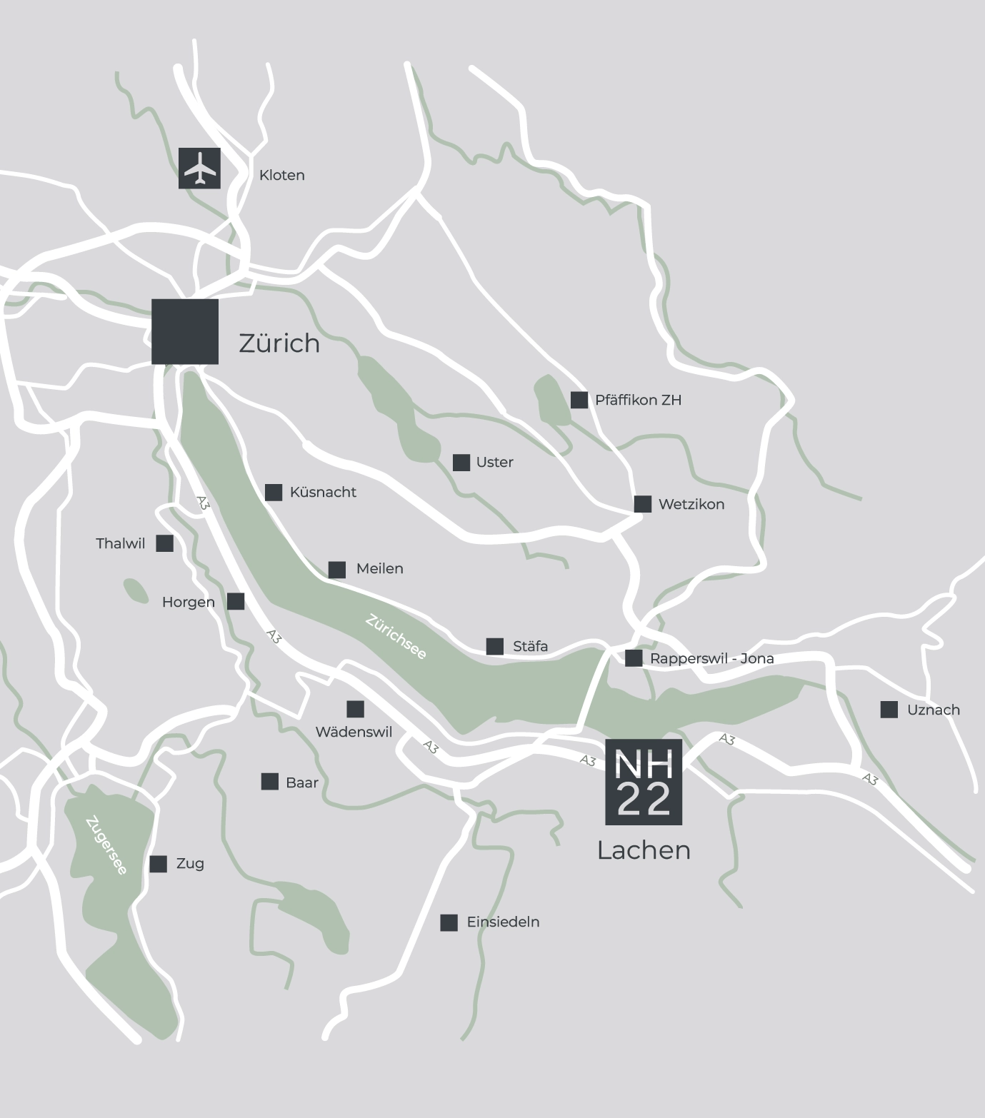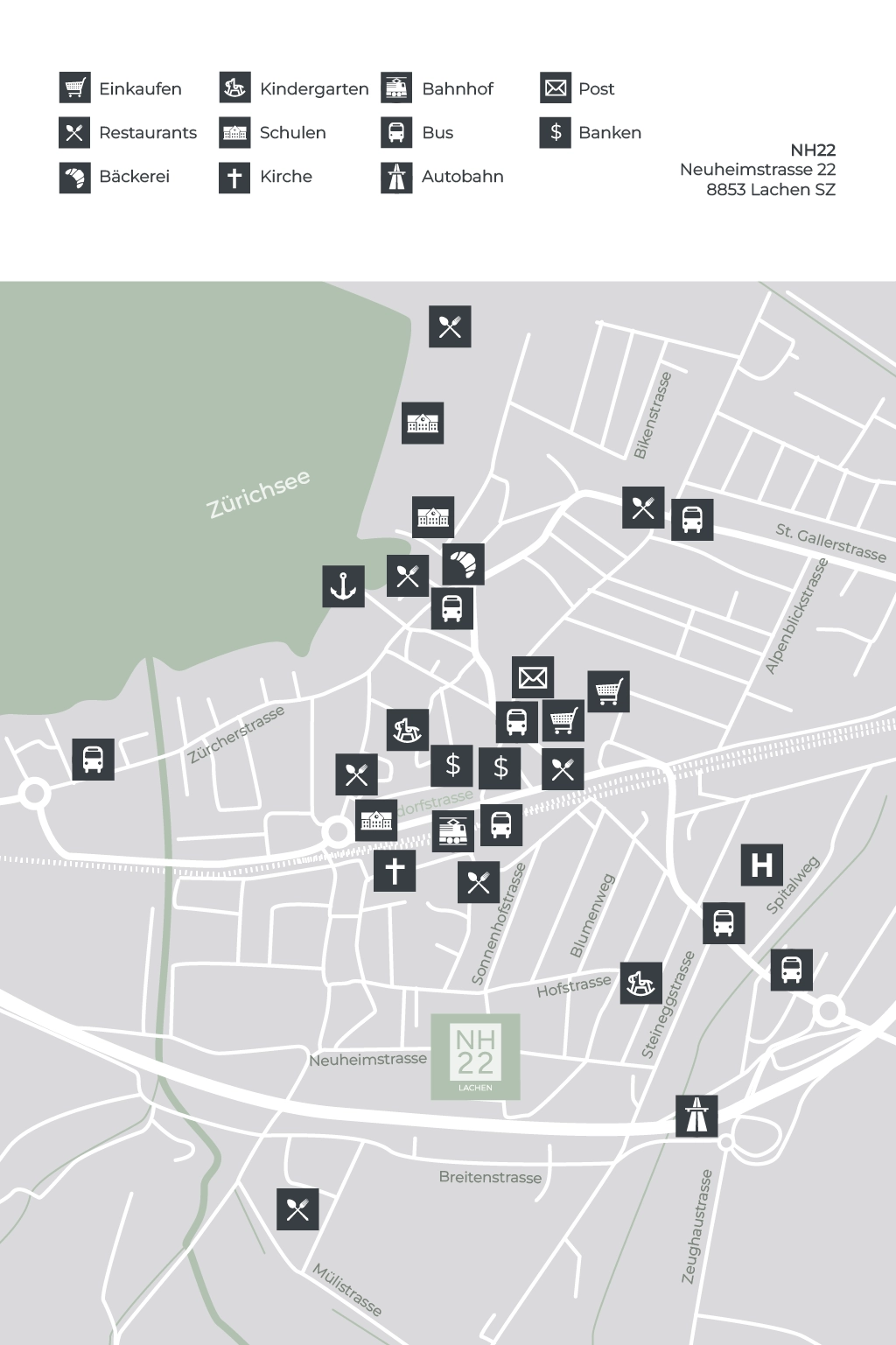 NH 22 entsteht in einem ruhigen Wohnquartier des Oberdorfs von Lachen. Der Durchgangsverkehr durch die Neuheimstrasse ist moderat, die nahe Autobahn ist abgeschirmt durch eine Schallschutzmauer und zwei Häuserzeilen.