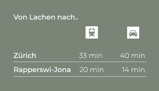 Im Dorfkern findet sich alles für den täglichen Bedarf. Und natürlich lockt der See zum Schwumm im beliebten Strandbad oder bei der äusseren Haab. Und wenn es Sie mal wegzieht, ist NH 22 ein perfekter Ausgangspunkt: zum Bahnhof Lachen sind es 8 Gehminuten, zur Autobahneinfahrt zwei Fahrminuten.